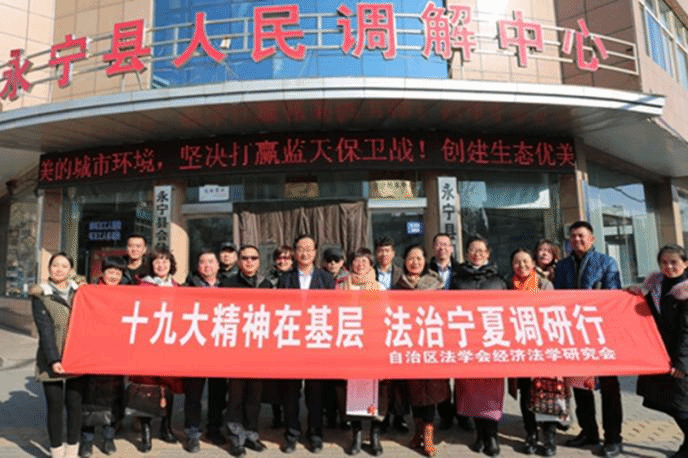 党委书记潘瑞、自治区法学会经济法学研究会会长刘芳教授的带领下,一行二十余人来到宁夏永宁县,调研永宁县司法局在人民调解和法治文化建设方面的创新工作。