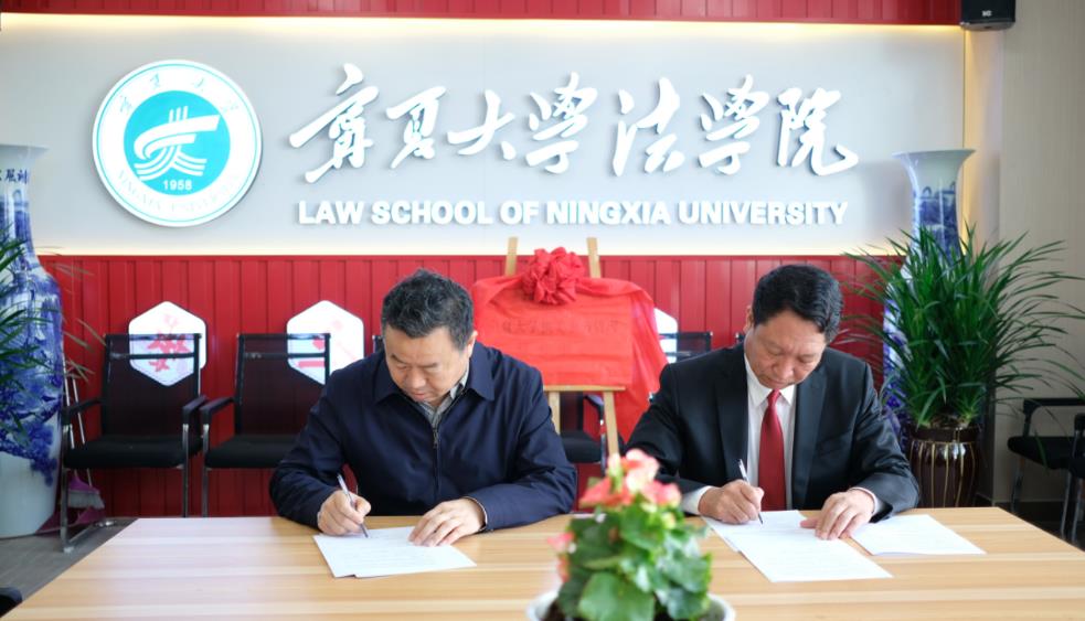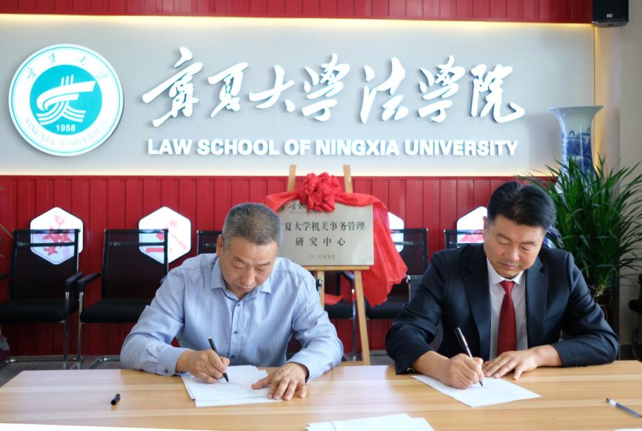 院长吕耀军与宁夏回族自治区机关事务管理局保障管理处长张惠军签署横向合作课题研究协议。)
