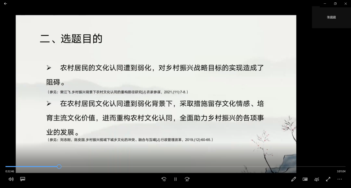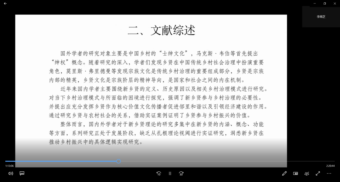 会议第三场,前期参与田野调研的18位同学分别围绕自己撰写的论文主题展开理论探讨与交流。论文主要涉及乡村振兴、生态文明、乡村文化再造与认同以及区域公共记忆等方面。论文交流过程中,同学们各抒己见,狄良川逐一进行点评,取得了良好效果。