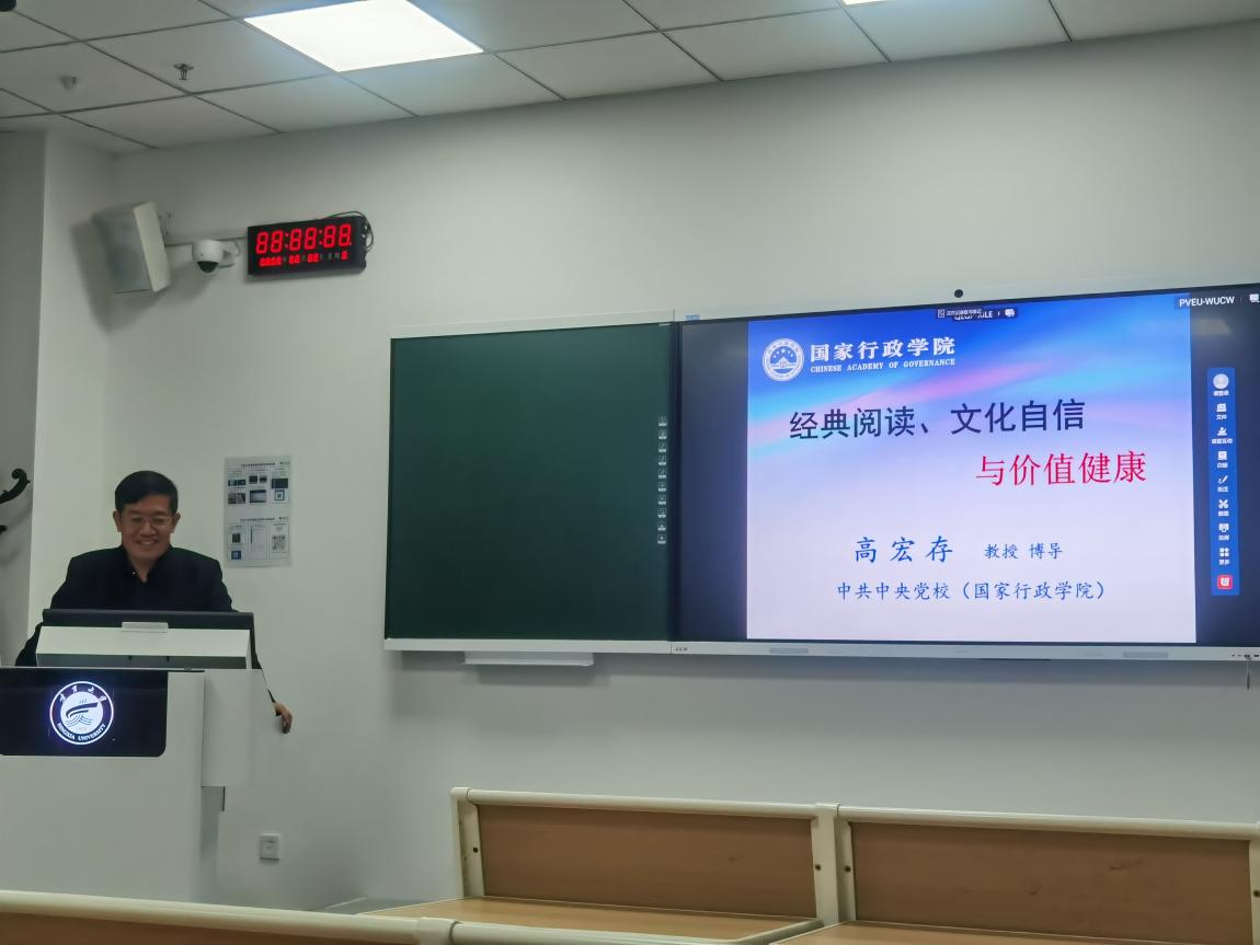高宏存教授强调“着力赓续中华文脉、推动中华优秀传统文化创造性转化和创新性发展”。高宏存教授通过冯友兰的“人生四境界说”告诉我们,境界不同所拥有的习性和行为,要对自己的行为有清楚的判断,不论是在哪种境界下要明白人生很短,切勿浪费自己的时间,要做有意义的事情、正确的事情。