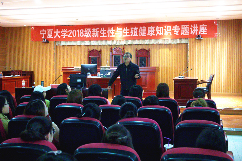 特邀生命科学学院生物科学系徐明教授、宁夏疾病预防控制中心的吴忠兰老师,在文荟楼模拟法庭为2018级全体新生做“性与生殖健康知识”专题讲座。