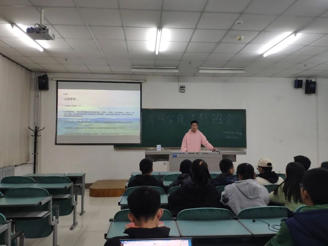 各班班长紧紧围绕消防安全主题,通过PPT讲解、播放火灾相关案例视频等形式,从学校火灾案例、学校防火须知、消防器具使用、火场逃生技巧四个方面向大家讲解了如何在日常生活中预防火灾的发生。