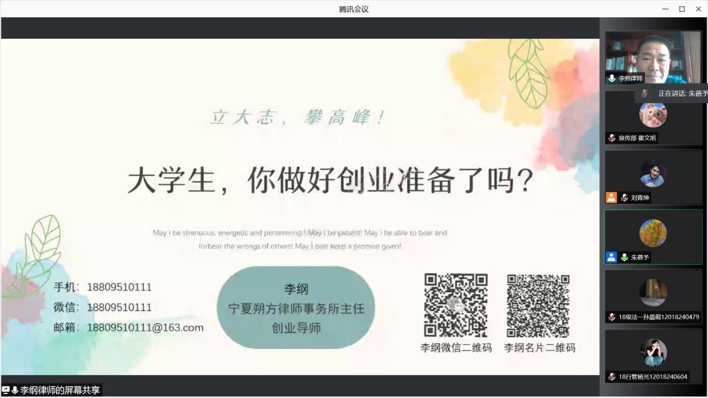 组织开展“大学生,你做好创业准备了吗?”主题线上讲座。本次讲座特邀宁夏朔方律师事务所主任、宁夏律师协会副秘书长李纲律师主讲,法律系主任朱蓓予及2018级全体本科生参加。