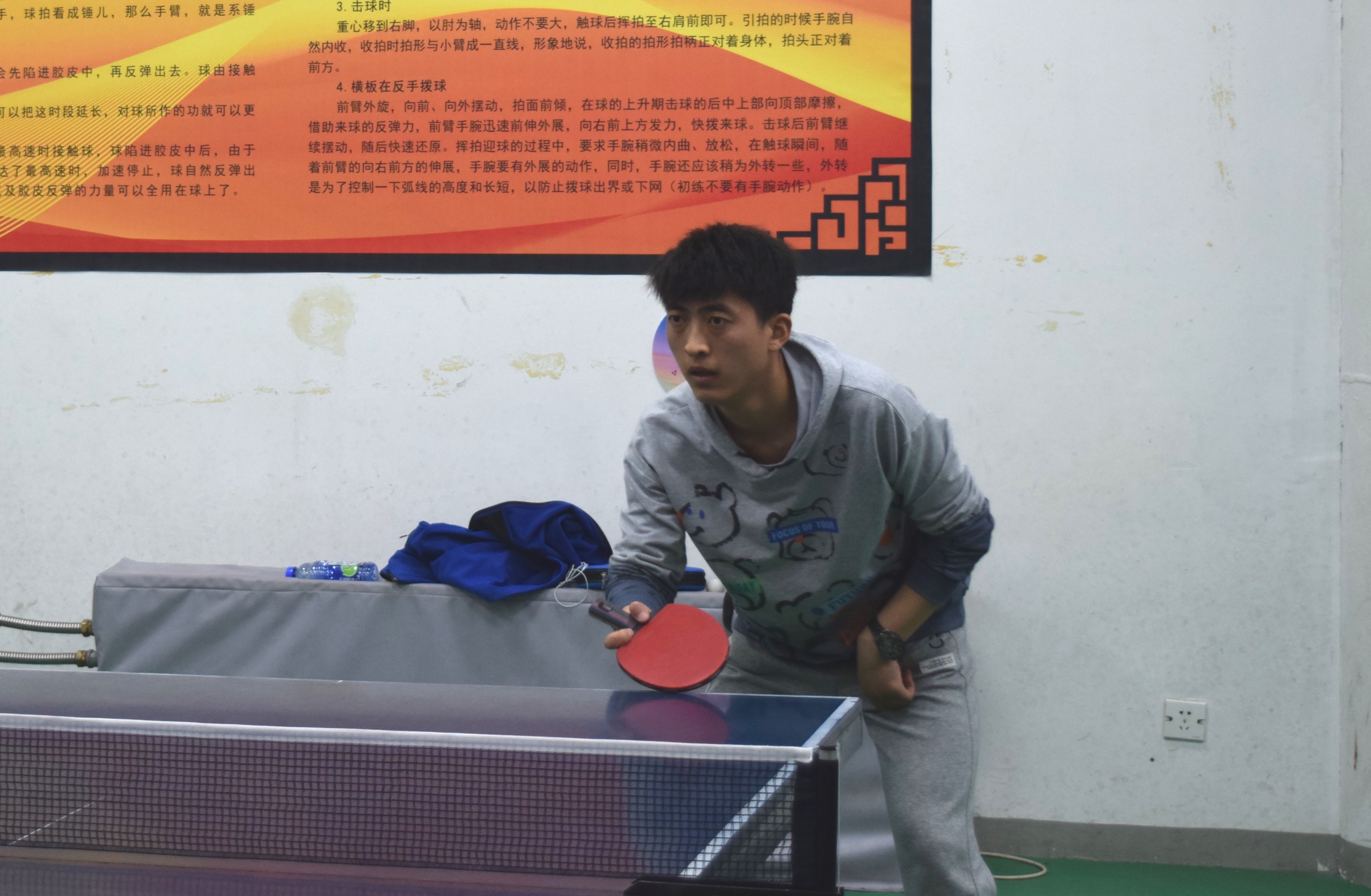 选手含胸收腹、上身前倾,锐利的眼神盯紧台上小小的乒乓球——