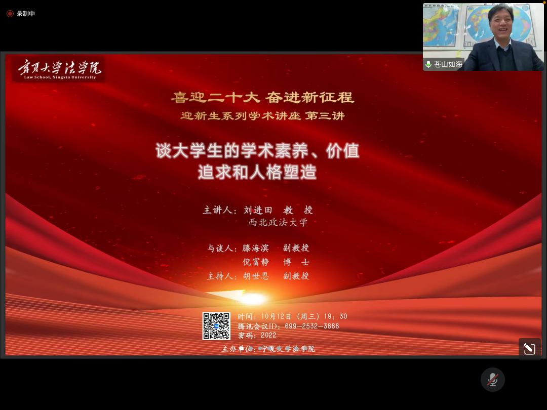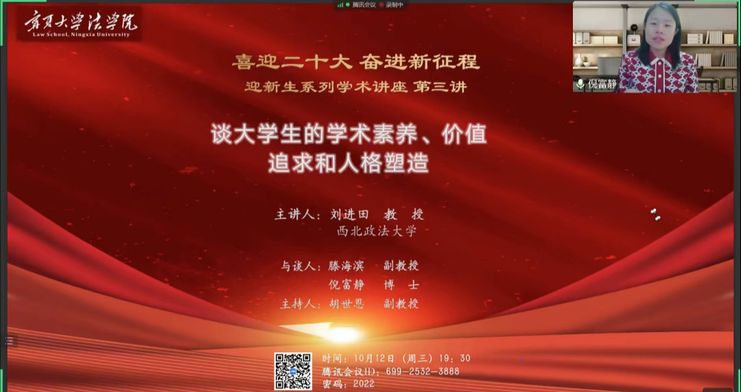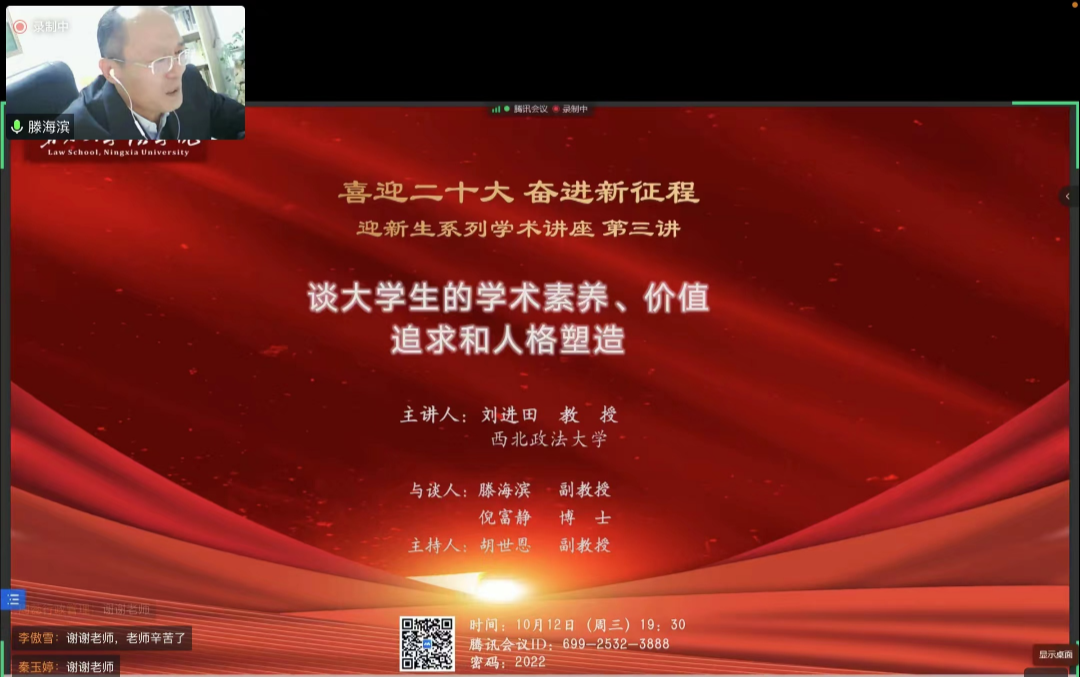 特邀西北政法大学文化与价值哲学研究院院长刘进田教授带来题为《谈大学生的学术素养、价值追求和人格塑造》的线上讲座。本次讲座由副院长胡世恩主持,滕海滨副教授和倪富静博士为与谈人。