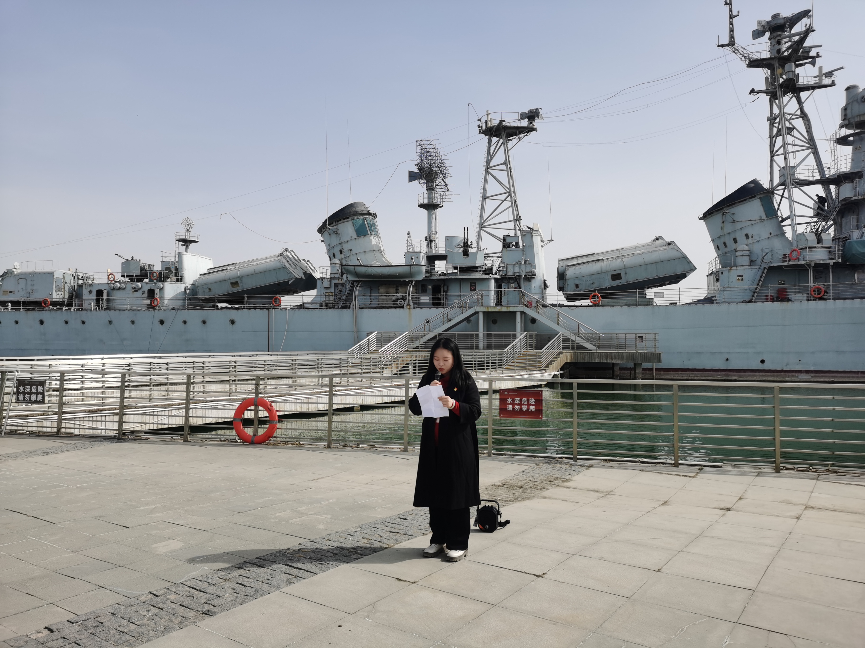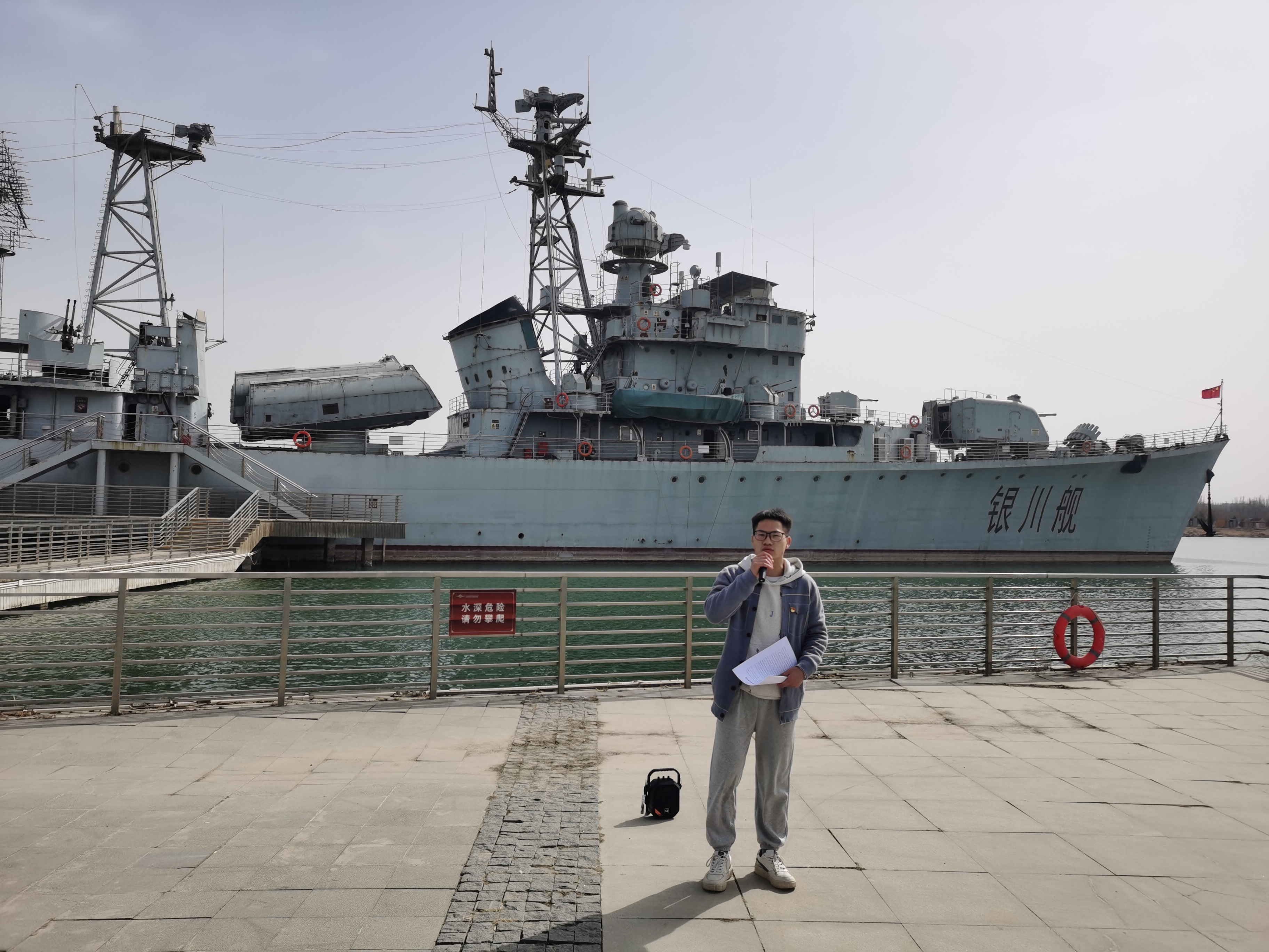 哲学与民族学研究生党支部范杰同志、法学研究生党支部胡杰同志在银川舰前发表主题演讲,讲述自己对“爱国主义”的理解和认识,随后,其他党员代表也纷纷发表参观后的感悟。