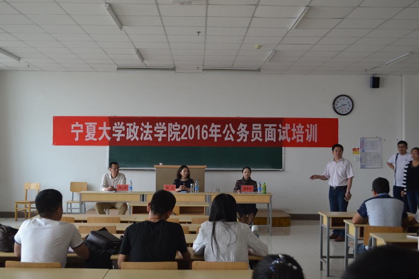 在文科楼404教室为已经通过公务员笔试的毕业生举办了模拟公务员面试培训。在培训现场,同学们有幸得到了多年担任全区公务员面试考官工作,有着丰富面试应考经验的学院副院长曲正老师,以及学院潘素洁、杨文林老师的详细讲解和悉心指导。