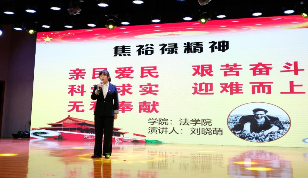 学生组的刘晓萌则讲述了焦裕禄同志的感人事迹。习近平总书记在河南省兰考县调研时指出,焦裕禄精神“过去是、现在是、将来仍然是我们党的宝贵精神财富,我们要永远向他学习”。刘晓萌从焦裕禄在兰考县排内涝、战风沙、治盐碱的故事讲起,歌颂了他党员心怀百姓、一切为人民的崇高精神。更在结尾表达出,作为新一代的青年大学生我们更应该化追思为力量,变成民族复兴的一颗颗种子,在革命先辈光芒的引领下,茁壮成长,奋发图强!